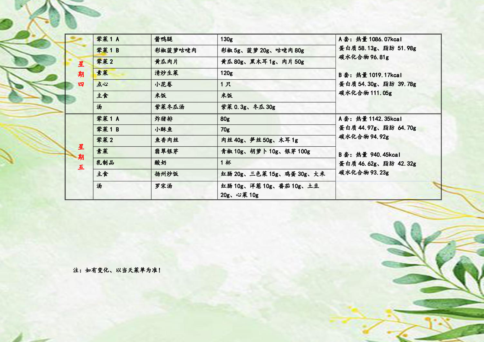 2024学年第二学期进才繁荣实验中学第四周学生菜单